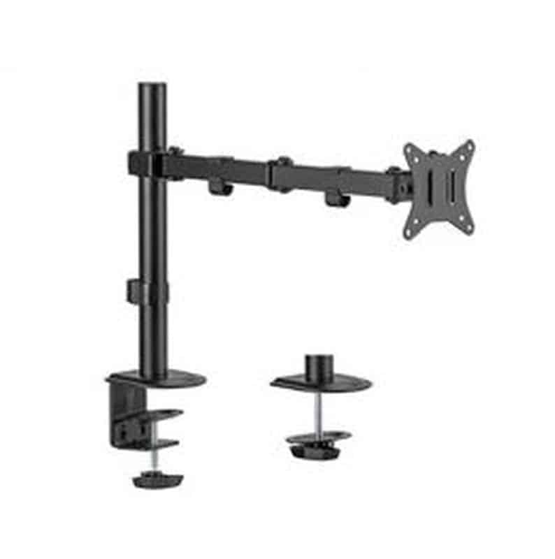 Soporte de escritorio para monitor con brazo para un solo monitor El brazo permite girar, extender, retraer o inclinar la pantalla y permite rotar la pantalla del modo horizontal al vertical, etc. Funciona con casi cualquier monitor LCD (máx. 32) Abrazadera o arandela de escritorio resistente para una fijación fácil y segura en su escritorio Gestión de cables integrada para un espacio de trabajo organizado y ordenado Compatible con VESA (100 x 100 mm y 75 x 75 mm) Especificaciones Material: acero, plástico Acabado superficial: recubrimiento en polvo Color: negro textura fina Ajuste el tamaño de la pantalla: 17 – 32 Capacidad de peso: 9 kg Compatible con Vesa: 100×100, 75×75 mm Rango de inclinación: +45 ~ -45 Rango de giro: +90 ~ -90 Rotación de pantalla: +180 ~ -180 Instalación: ojal, abrazadera Espesor de escritorio sugerido: abrazadera: 10 ~ 85 mm.