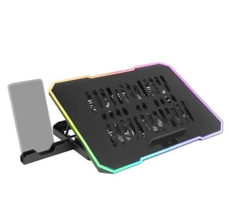 BASE REFRIGERADORA Y STAND MNBC7 Refrigera tu portátil con estilo y eficiencia con la base MNBC7. Función stand con 6 posiciones regulables y smartphone holder. Diseñada con una estructura de acero resistente, rejilla de aluminio y ABS, esta base proporciona un soporte perfecto para portátiles de hasta 16.