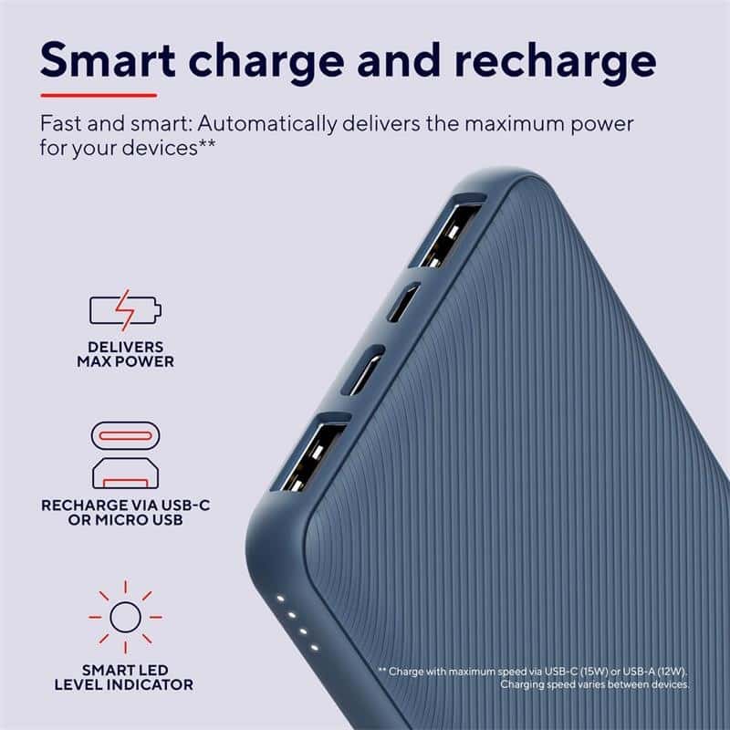 Pequeña en tamaño, pero grande en funcionalidad, la batería externa Primo ofrece una capacidad de 10 000 mAh en un diseño compacto que cabe fácilmente en cualquier bolsa. Con este compañero de viaje la conexión está garantizada siempre que se esté dando una vuelta; carga totalmente el teléfono hasta 4 veces y garantiza hasta 46 horas adicionales de batería de teléfono o 12 horas adicionales en el caso de la tableta.* *Depende de la marca y del modelo y del estado de la batería. Meramente indicativo