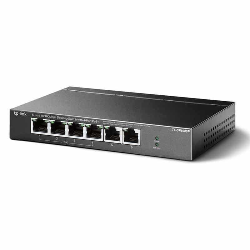 TP-Link TL-SF1006P es un switch profesional de alta potencia con 4 puertos PoE+ plug Play, con transmisión PoE para vigilancia hasta 250m.