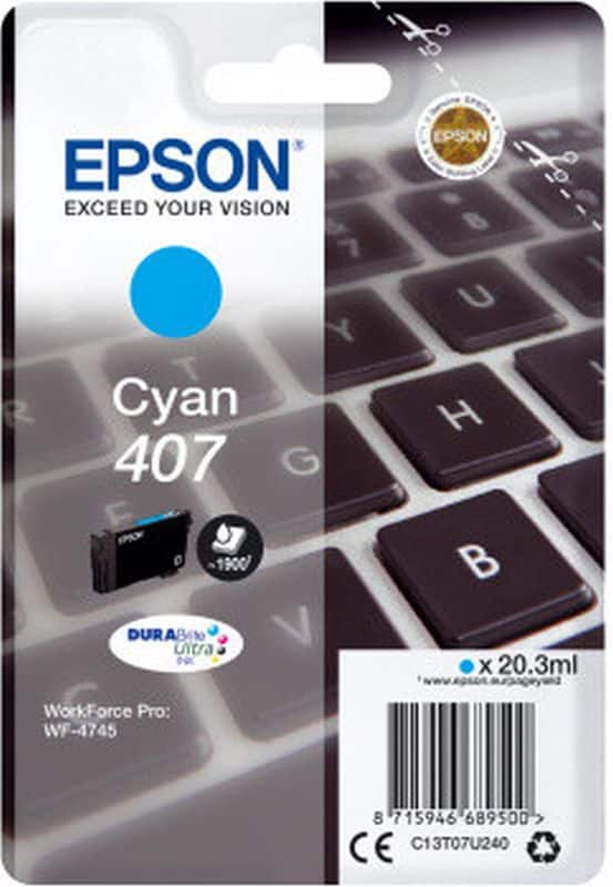 Cartucho de tinta original Epson 407 (teclado) de color cian con ref. C13T07U240 y una capacidad de 38,1 ml que se traduce en un rendimiento aproximado de 1.900 páginas. Consumible apto para su uso en las impresoras Epson WF-4745 Series